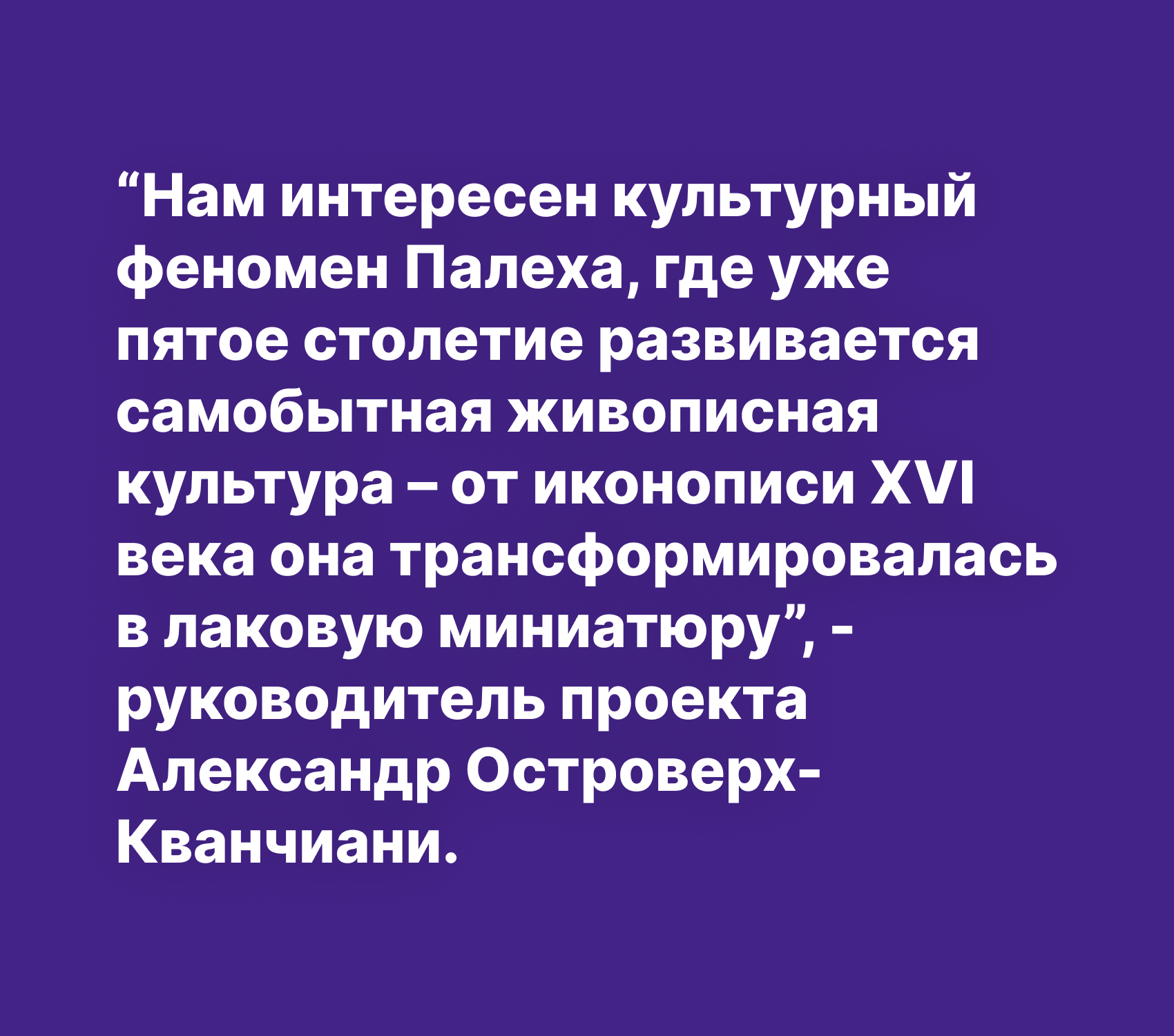 «Нам интересен культурный феномен Палеха, где уже пятое столетие развивается самобытная живописная культура – от иконописи XVI века она трансформировалась в лаковую миниатюру. А сегодня мы наблюдаем развитие палехского стиля уже в современных направлениях искусства, но на благодатной почве древних промыслов», – рассказал о планах на проект директор кинокомпании «Нью Синема Дистрибьюшн» и «Евразийского фонда гуманитарных ценностей», руководитель проекта Александр Островерх-Кванчиани.