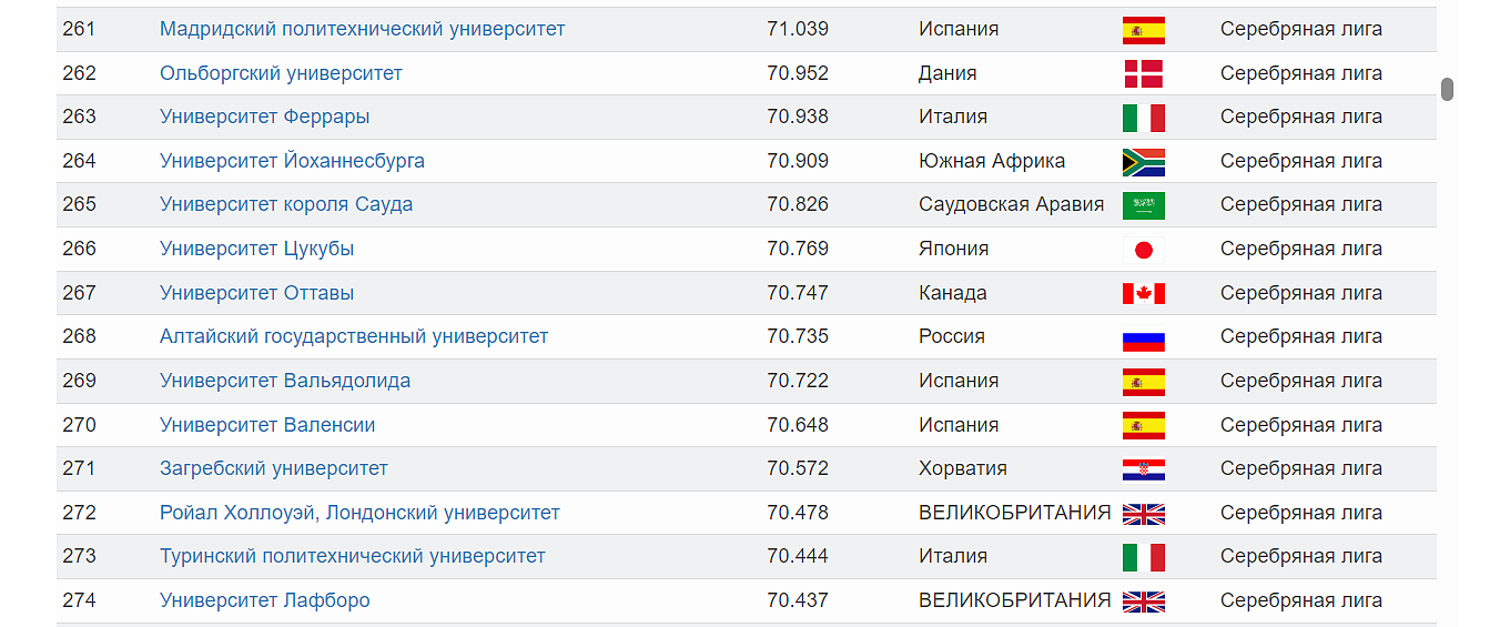 Следует отметить, что АлтГУ в данном рейтинге совершил буквально прорыв. Если в 2022 он занимал 18 место среди российских вузов, в 2023 – 17, то в 2024 он поднялся сразу на 8 место, и с 483 места до 268 – в мировом рейтинге, сменив тем самым «Медную лигу» на «Серебряную лигу». Кстати, в «Серебряную лигу» рейтинга RUR в 2024 году вместе с АлтГУ из российских вузов вошел только Сибирский федеральный университет.