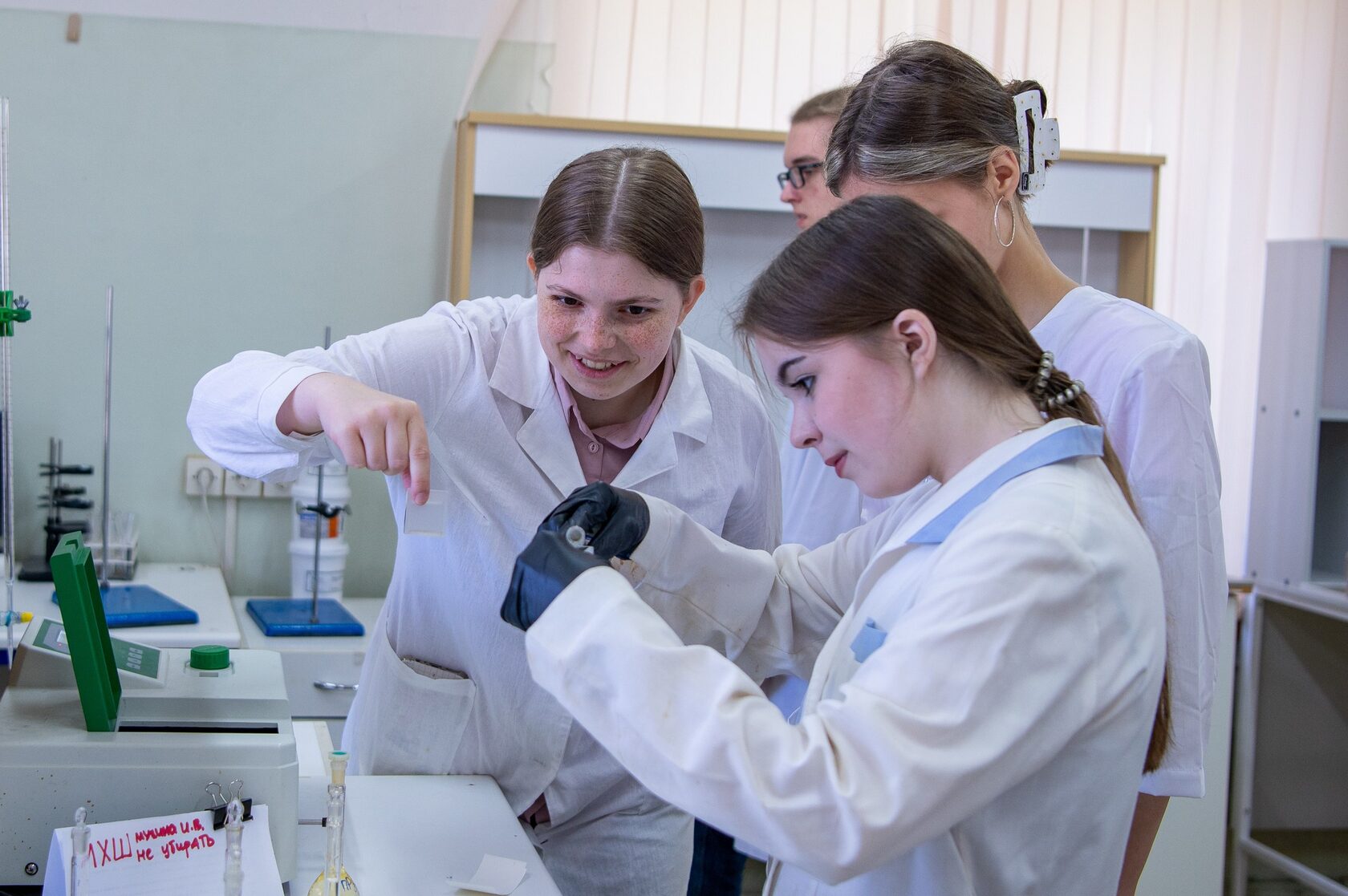 Ребята в составе небольших групп выполняли исследовательские проекты по тематикам: «Химический детектив: качественные реакции», «Количественный анализ органического углерода в объектах», «Синтезлюминесцирующих наночастиц», «Современные методы аналитической химии»,
