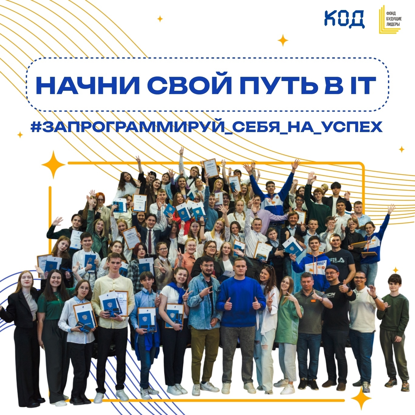 Прямо сейчас Фонд "Будущие лидеры" ведет набор учеников, приглашает школьников принять участие в проекте и освоить ИТ-навыки в новом учебном году! Обучение проводится с ноября по апрель и включает лекции, практические занятия, групповые проекты, встречи с профессионалами ИТ-сферы и множество инициатив, направленных на интересное и эффективное обучение. Полный курс обучения длится 3 года, по окончании участники получают Свидетельство о дополнительном образовании по выбранному направлению (Backend-разработка, Frontend-разработка, UX/UI-дизайн) и Свидетельство о присвоении квалификации «Оператор электронно-вычислительных и вычислительных машин». Также после успешного прохождения 1 года обучения предоставляется Сертификат о прохождении курса. В 2024 году более 120 участников успешно завершили курс и продолжат обучение в рамках следующих программ на проекте «КОД».