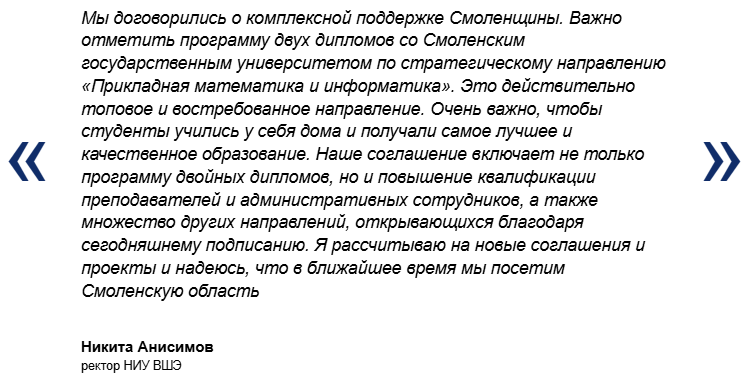 Помимо реализации программы двух дипломов, Высшая школа экономики в рамках соглашения будет участвовать в проведении аналитических исследований в разных областях науки вместе с Правительством Смоленской области и СмолГУ, организовать переподготовку и повышение квалификации госслужащих Смоленской области, повышать квалификацию научных сотрудников СмолГУ, разрабатывать образовательные программы по запросу руководителей региона.