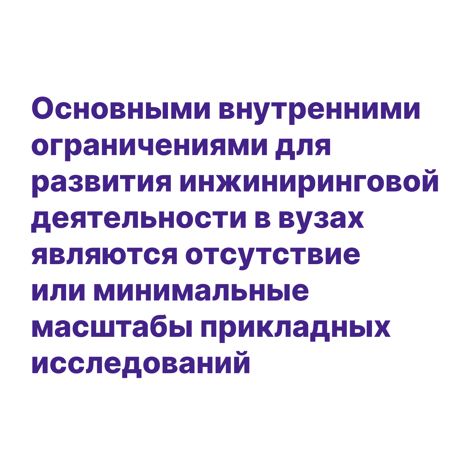 - Основными внутренними ограничениями для развития инжиниринговой деятельности в вузах являются отсутствие или минимальные масштабы прикладных исследований; дефицит оборудования и компетентных кадров, отсутствие или недостаточный опыт участия исследовательских команд в проектах по внедрению разработок; слабые навыки управления проектами; пассивная позиция на рынке; слабо проработанная стратегия развития, отсутствие эффективного проектного офиса.
